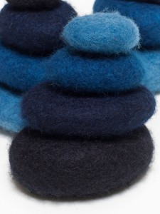 Untitled Stones (detail) Indigo dyed wool, stones, hand felted. 2006 6″ x 6″ x 6″ per stack